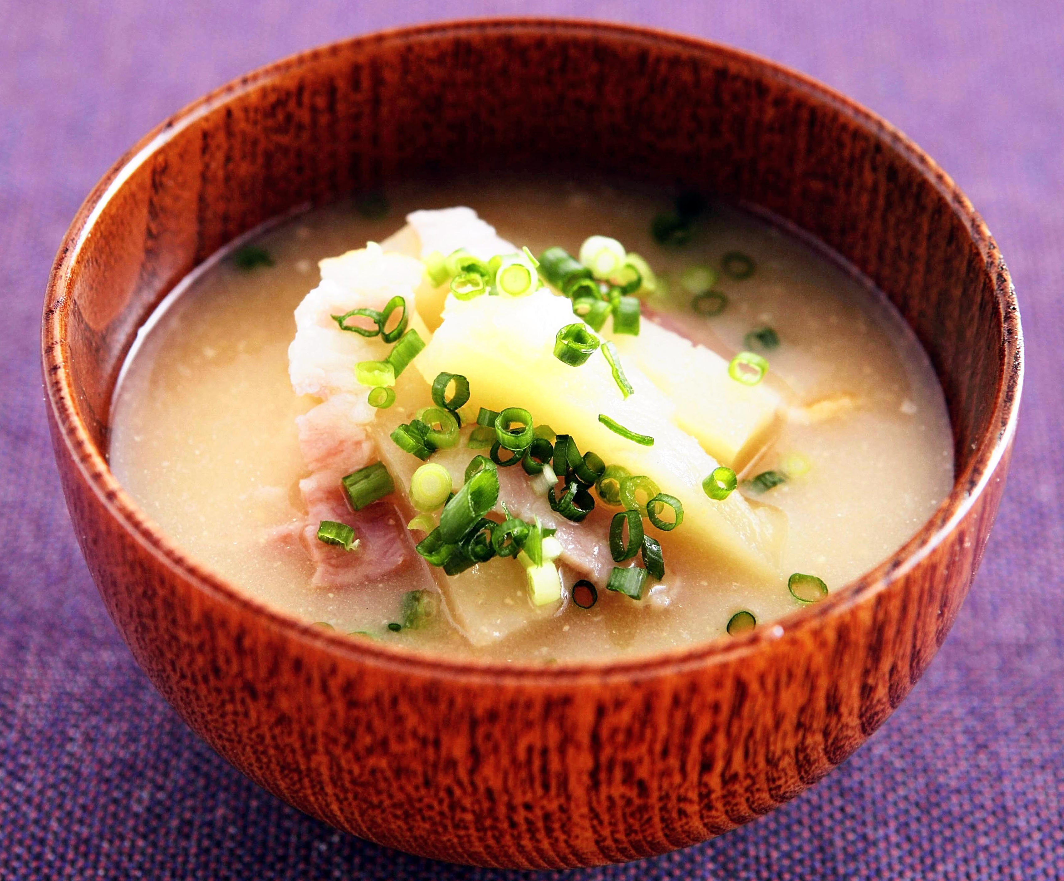 1人分115キロカロリー、塩分2.3グラム (1)2人分でスライスベーコン2枚、ジャガ芋200グラム、和風だしのもと(かつお)小さじ1/2、みそ24グラム前後、青ネギ8グラムを用意します。 (2)ベーコンは幅1センチに切り、ジャガ芋は皮をむいて拍子木切りにして水にさらします。青ネギは小口切りにします。 (3)鍋にベーコンを入れて弱火にかけ、脂がにじみ出てくるように焼き、ジャガ芋を加えて軽く炒...