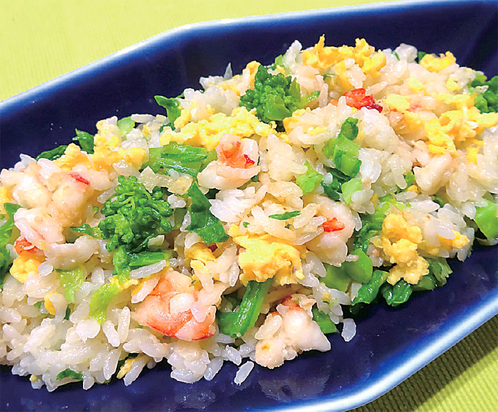 【栄養価】エネルギー557キロカロリー、食塩相当量1.9グラム ※1人分の値 ◆材料<2人分>・ご飯(温かいもの)........茶碗2杯分(約300グラム)・エビ........中8尾 (下処理用の塩、酒)........少々・菜の花........1/2束・卵........2個・ニンニク........1片・オリーブ油........大さじ1・バター........大さじ1 【A】 酒、みそ........各大さじ1 みりん........小さじ2 しょうゆ...........