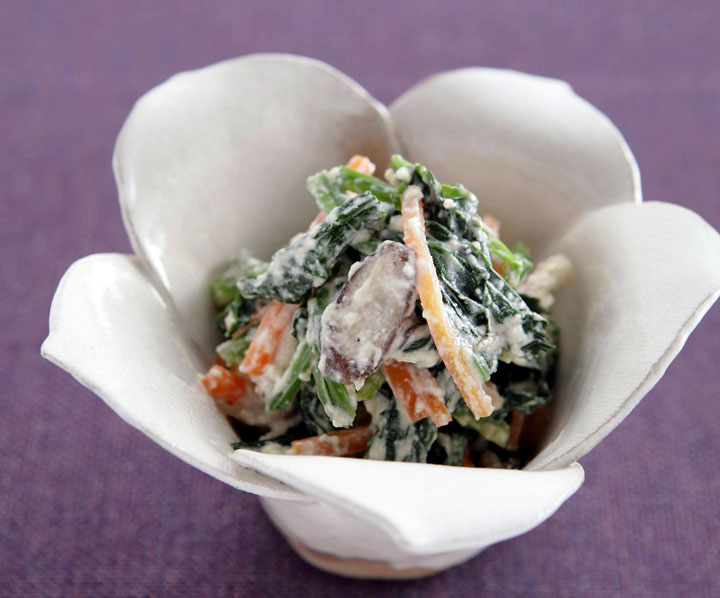 1人分133キロカロリー、塩分0.8グラム (1)2人分でホウレン草100グラム、シイタケ2個、ニンジン40グラム、酒小さじ1/2、牛乳200cc、酢大さじ1/2、A(白ねりごま10グラム、砂糖小さじ2、しょうゆ小さじ1、塩少々)を用意します。 (2)ホウレン草はゆでて根元を除き、長さ3~4センチに切り、もう一度よくしぼります。シイタケはかさと軸ともに薄切り、ニンジンは長さ4センチくらいの太め...