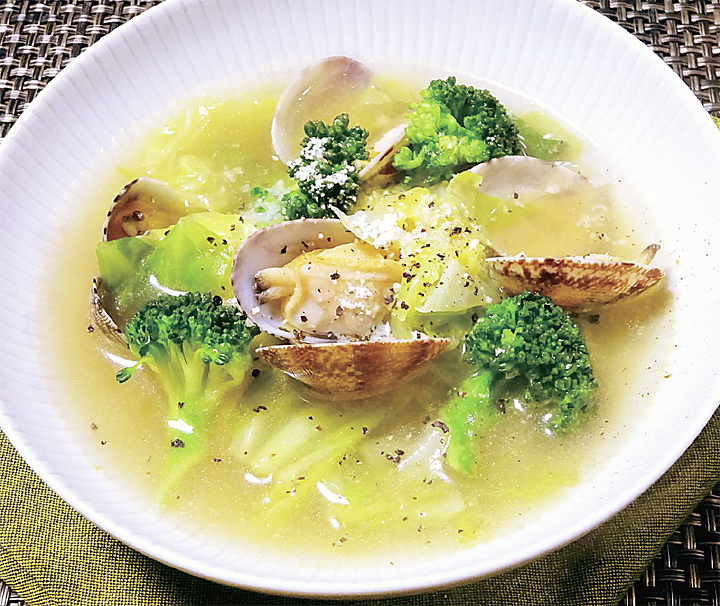 【栄養価】エネルギー82キロカロリー、食塩相当量1.6グラム ※1人分の値 ◆材料<4人分>・キャベツ........200グラム・ブロッコリー........80グラム・アサリ(殻付き)........250グラム・パルメザンチーズ........少量・オリーブ油........大さじ1・酒........大さじ2・ブイヨンスープ........600CC(湯600CC、ブイヨンの素1個)・みそ........大さじ1・粗挽きブラックペッパー........少々 ◆作...