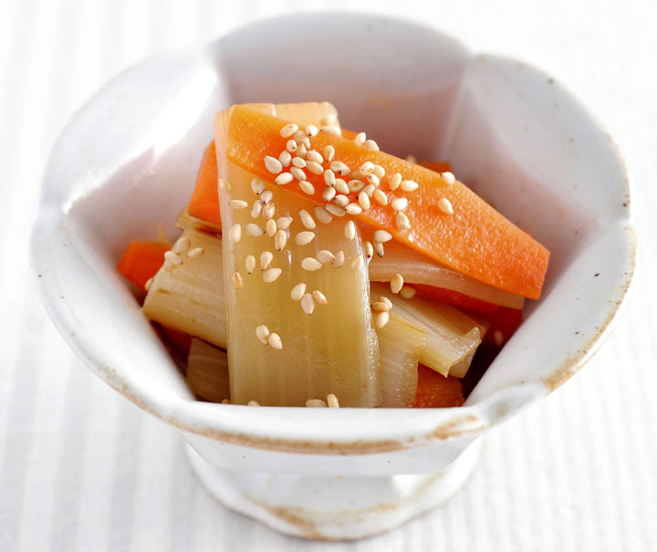 1人分72キロカロリー、塩分0.5グラム(1)2人分でウド200グラム、ニンジン60グラム、白いりごま小さじ1を用意します。(2)ウドは皮をやや厚めにむき、ニンジンも皮をむいて、それぞれ長さ4センチほどの短冊切りにします。(3)サラダ油小さじ1を熱したフライパンにウドを入れ、中火から強火でしっかり炒めます。ニンジンを加えてしんなりするまで炒めます。(4)火を止めて砂糖としょうゆ、みりん各小さじ1...