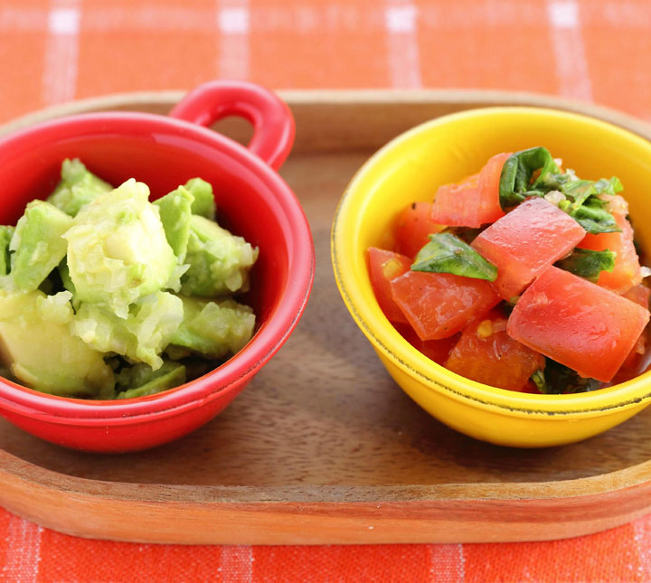 1人分76キロカロリー、塩分1.1グラム(1)2人分でトマト1個、A(塩小さじ1/4、黒こしょうとペッパーソース各少々、エキストラバージンオリーブ油小さじ1、玉ネギ10グラム、バジルの葉2枚)、アボカド1/2個、レモン果汁小さじ1/2、B(塩少々、玉ネギ10グラム、バジルの茎)を用意します。(2)トマトは1センチの角切りにしてボウルに入れ、砂糖少々を加えて全体になじませ、しばらくおいておきます。...