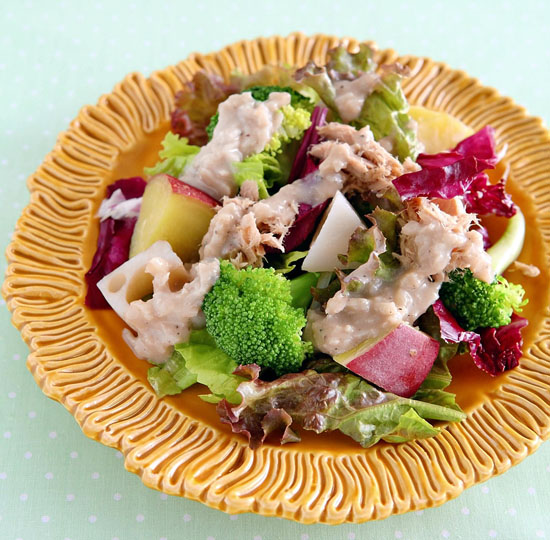 1人分90キロカロリー、塩分0.6グラム(1)2人分でサニーレタス40グラム、トレビス20グラム、レンコンとサツマ芋、ブロッコリー各40グラム、ノンオイルのツナ缶1/2個、ニンニク20グラム、牛乳40cc、アンチョビーペースト5グラムを用意します。(2)レタスとトレビスはちぎって水に漬けます。レンコンは乱切り、サツマ芋は皮付きで乱切りにしてそれぞれ水にさらし、水気を切ります。ブロッコリーは花蕾(か...