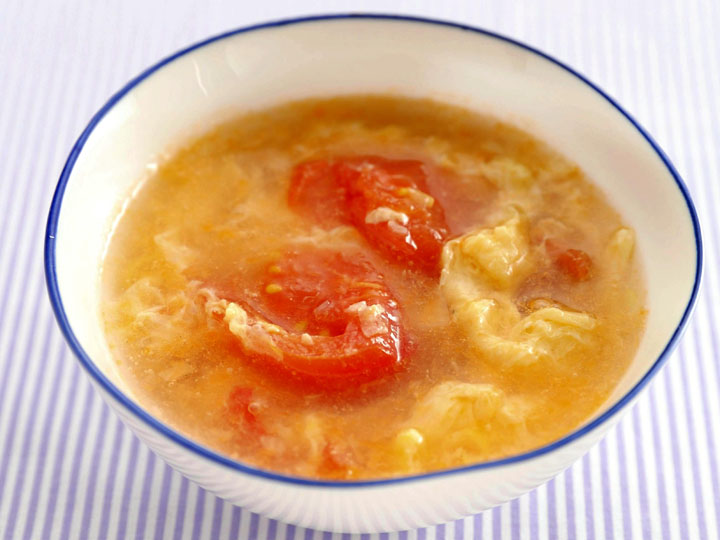 1人分72キロカロリー、塩分1.8グラム(1)2人分で白ネギ10グラム、鶏がらスープのもと小さじ2、トマト1個、片栗粉小さじ1/2、卵1個を用意します。(2)白ネギはみじん切り、トマトはくし形切りにして斜め半分に切ります。片栗粉を水小さじ1で溶き、卵は溶きほぐします。(3)鍋に白ネギとスープのもとを入れてまぜ、水分が出るまでしばらく置きます。水400ccと酒大さじ1を加えてひと煮立ちさせ、トマトを...