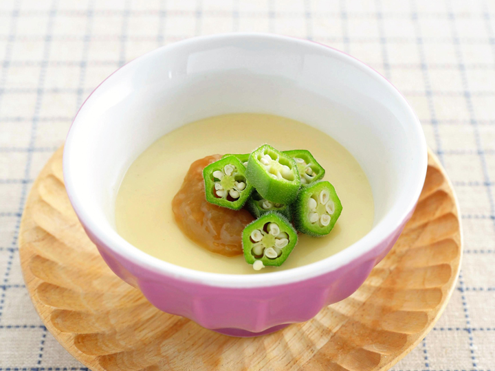 1人分75キロカロリー、塩分1.4グラム(1)2人分で卵1個、無調整豆乳100cc、和風だしのもと小さじ1/2、梅干し2個、みりん小さじ1/2、オクラ2本を用意します。(2)和風だしのもとに熱湯小さじ1/2を加えて溶かし、無調整豆乳、水50cc、塩としょうゆ各少々と合わせ、調味液を作ります。梅干しは種を除いてペースト状にし、みりんを合わせてまぜます。オクラは板ずりをしてゆで、小口切りにします。(3...