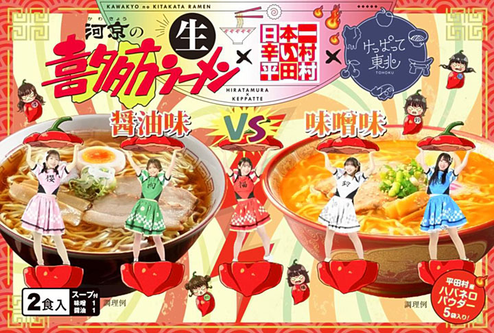 食料・飲料卸売業「渋谷レックス」(福島市)は平田村産ハバネロを使った新商品「ハバネロラーメン第2弾」を開発した。喜多方ラーメン製造販売の河京(喜多方市)とアイドルグループ「けっぱって東北」、道の駅ひらた(同村)と共同開発した商品で、同道の駅などで販売している。