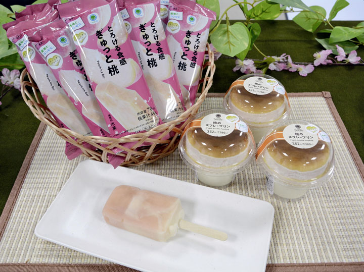 ファミリーマート(東京都)は、県産モモ「あかつき」や「まどか」など計5種類を使った2商品を販売する。13日からアイスバー「とろける食感 ぎゅっと桃」(198円)を全国1万6200店舗、6月27日から新商品「桃のスフレ・プリン」(380円)を東北地方の約1260店舗で数量限定で販売する。