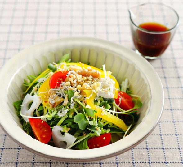 1人分78キロカロリー、塩分0.9グラム (1)2人分で水菜40グラム、カイワレ菜30グラム、キュウリ1/4本、黄パプリカ20グラム、レンコン30グラム、プチトマト2個、白いりごま小さじ1/2、ローストしたクルミとアーモンドダイス、ちりめんじゃこ各5グラム、A(ゆずこしょう小さじ1/4、しょうゆとみりん各小さじ1)を用意します。 (2)水菜は長さ5センチ、カイワレ菜は半分の長さに切り、キュウリ...