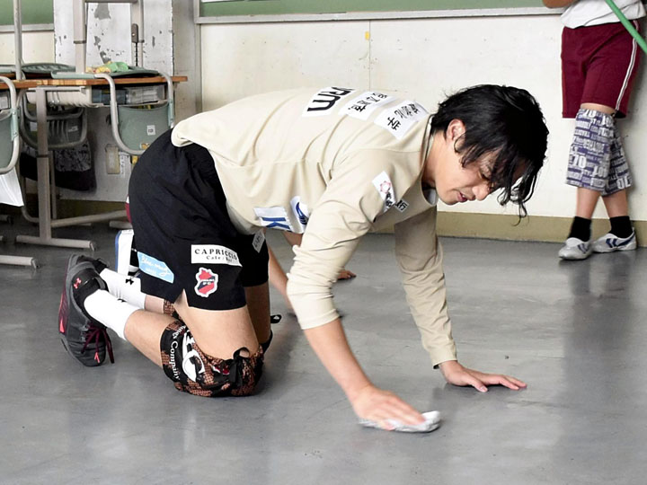 【番記者のつぶやき】膝当て付け磐崎小で雑巾がけ