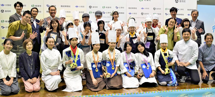 4町の農産品の魅力を発信し、生産拡大や風評払拭を目指して開催。各町の食材の4部門に全国120校から547組が応募し、書類審査を経て4部門各3組が決勝大会に出場した。決勝大会では実際に調理し、シェフらが試食審査した。各部門で最優秀賞を決めて4町の町長らが表彰した。