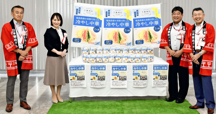 アルファ電子(天栄村)が開発した県産米を使った米粉麺「う米(まい)めん」シリーズの一つ「福島県産の米粉で作った冷やし中華」が郡山市などの郵便局で、期間限定で店頭販売を開始した。9月末まで。