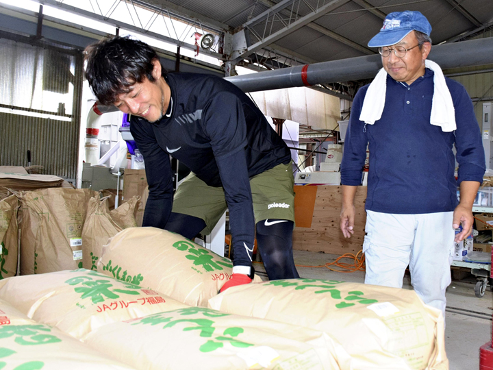 浪江町立野の農家佐藤秀和さん(53)の作業場に29日、山本さんの姿があった。Jリーグ通算274試合に出場した守護神が手にはめているのは、ゴールを守ったキーパーグローブではなく軍手だ。2人は一緒にコメ作りに取り組んでおり、この日は新米の出荷作業を行った。もみすりが終わった玄米を慣れた様子で袋詰めし、身長188センチの長身をかがめながら、約30キロの袋を何度も運んで汗を流した。