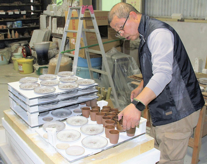 二本松市で開かれる二本松の菊人形会場を飾った菊花を焼き物の釉薬(ゆうやく)に再活用した「菊花釉」の今年の作品が出そろった。県の伝統的工芸品「二本松萬古焼」唯一の窯元井上窯当主の井上善夫さん(76)がおととしから取り組んでいる。今回は大菊を中心に回収、焼却して釉薬を作っていて、井上さんは「色合いはほとんど変わらないが、釉薬としては柔らかいようだ。濃度や焼く温度を変えて特性を見極めたい」と定着へ意欲を見せている。