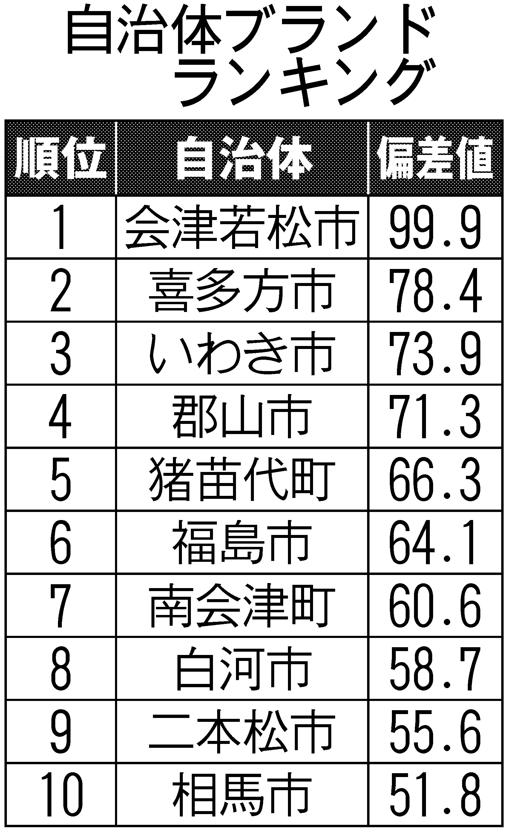 大東建託(東京都)は8日、「いい部屋ネット 街の住みここちランキング」の特別集計として、自治体のイメージや知名度を調査した「自治体ブランドランキング2025」を発表した。本県版のランキングでは、1位が会津若松市、2位が喜多方市、3位がいわき市だった。4位に郡山市、5位に猪苗代町と続き、昨年から変動はなかった。