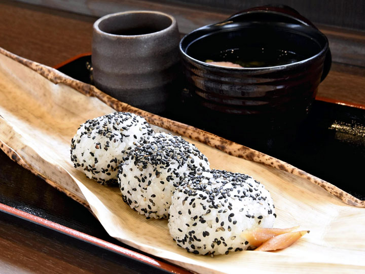 黒ごまむすびはべらぼう第30話で、白河藩主で老中を務めた松平定信が質素倹約を掲げて仲間と食べた場面で登場。今回は地元産コシヒカリを使用し、具が3種類で3個入り400円。