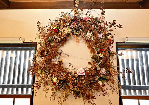 店内に飾られた縦横1メートルほどの大きなドライフラワーリースは、弘子さんの手作り。店の雰囲気に合うように、バラやユーカリなどを組み合わせて作った。