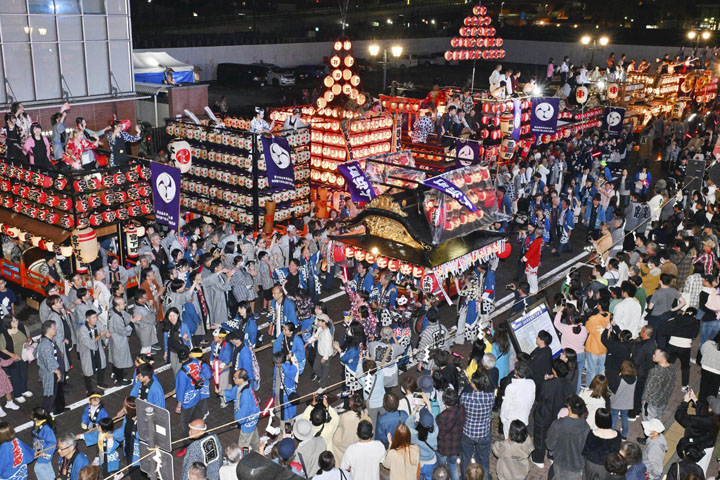 福島稲荷神社例大祭の最大見どころ「福島秋祭り連山車」は12日、福島市中心部で繰り広げられ、数多くのちょうちんで飾られた山車が連なり、秋の夜を彩った。