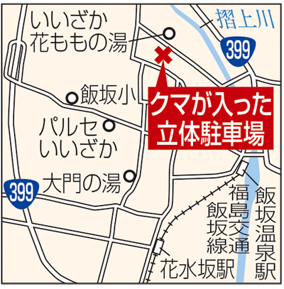 13日夜、福島市の飯坂温泉にある立体駐車場にクマ1頭が入り込み、日帰り温泉が営業を停止、利用客約50人が一時足止めされた。
