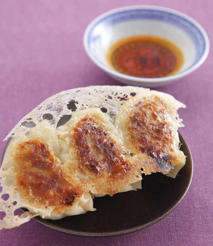 1人分213キロカロリー、塩分1.3グラム (1)2人分で大判のギョーザの皮6枚、豚ひき肉60グラム、白菜80グラム、ニラ20グラム、A(おろしショウガとおろしニンニク各小さじ1/4、しょうゆとオイスターソース各小さじ1/2、ごま油小さじ1)、片栗粉小さじ1、B(しょうゆと酢各小さじ1、ラー油小さじ1/4)を用意します。 (2)白菜はみじん切りにして塩を加えてもみ、5分ほど置いて水気をしぼりま...
