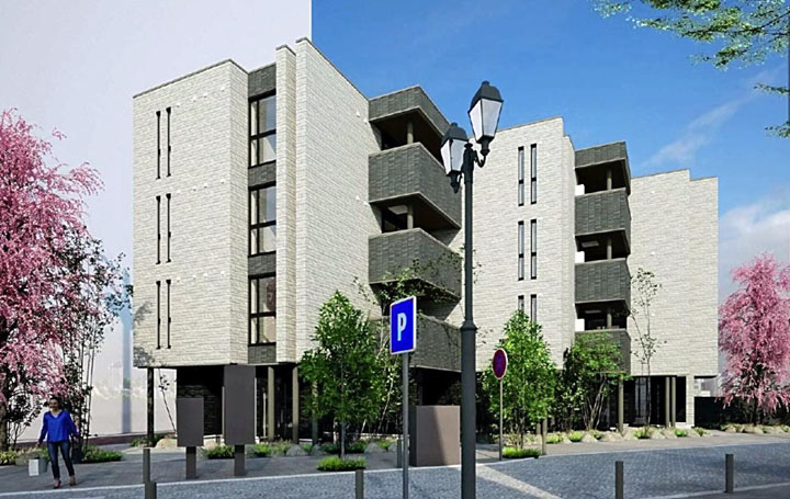 エリートヒルズは新業態のマンションブランドとして26年12月の完成を見込む。4階建てで1階に店舗、2~4階に単身者から家族向けまで15世帯分の賃貸住宅が入る。シャッター付きのガレージも設ける計画だ。