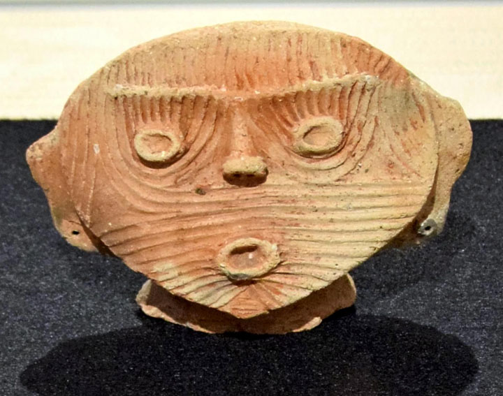 白河市の県文化財センター白河館まほろんで25日、新たに収蔵された出土品を集めた企画展が始まった。中でも顔全体に入れ墨のような線刻が施された黥面(げいめん)土偶の頭部が注目を集めている。12月14日まで。