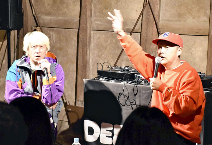 いずれもヒップホップグループのTOKYO No.1 SOUL SETのメンバーBIKKEさんとスチャダラパーのメンバーBoseさんによるトークイベントが25日、福島市飯坂町の旧堀切邸で開かれた。
