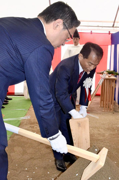 式では、イオンモールの南慎一郎取締役上席執行役員開発担当や日和田ショッピングモールの山菅貴史社長らがくわ入れをした。山菅社長は式後、報道陣の取材に「子育て世代から高齢者まで、さまざまな人が楽しめる施設にしたい」と述べた。