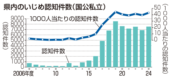 県内のいじめの認知件数は【グラフ】の通り。7543件のうち公立学校は7378件で内訳は小学校5732件(前年度比507件増)、中学校1322件(同80件減)、高校303件(同50件増)、特別支援学校21件(同17件増)だった。