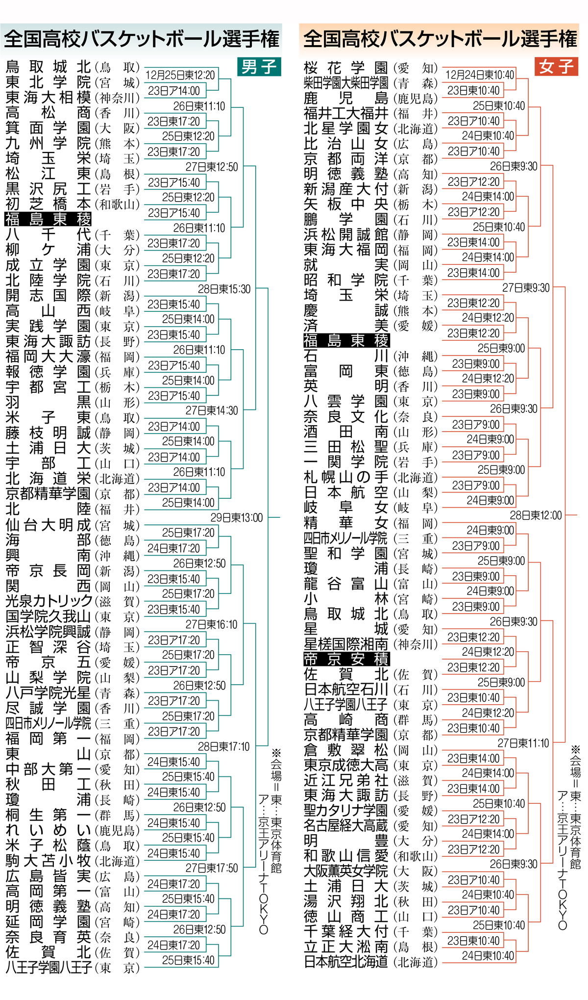 男子で2大会連続5度目の優勝を目指す福岡大大濠は1回戦で報徳学園(兵庫)と対戦、全国高校総体で初優勝した鳥取城北は2回戦が初戦で、東北学院(宮城)―東海大相模(神奈川)の勝者とぶつかる。女子で4連覇が懸かる京都精華学園は1回戦で高崎商(群馬)と顔を合わせる。