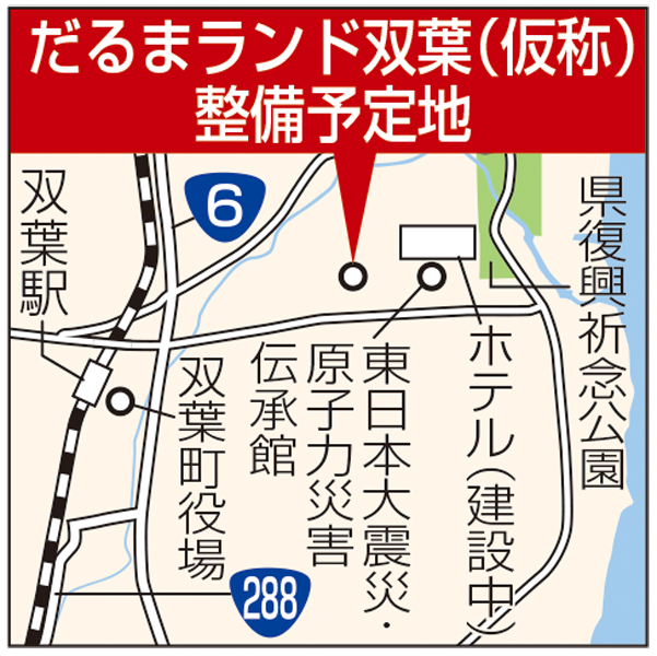江戸時代から続く新春の恒例行事「双葉町ダルマ市」で知られる同町にだるまの製造販売、観光体験が一体となった施設が整備される。町の縁起物「双葉ダルマ」の製造を手がける白河だるま総本舗(白河市)が設立した新会社「だるまランド」が運営、2028年春の開所を目指す。