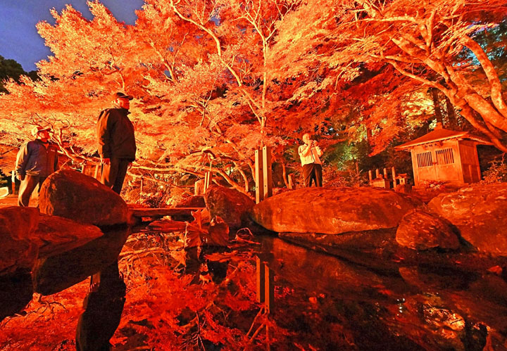 南相馬市鹿島区の宝蔵寺で22~24日、紅葉のライトアップが行われる。21日に試験点灯が行われ、見頃を迎えた紅葉が光に照らされ、幻想的な光景が浮かび上がった。