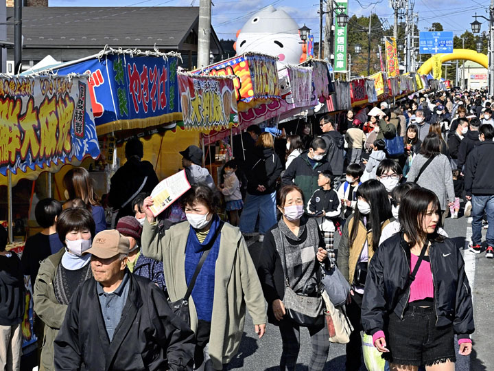 150年以上の歴史を誇る浪江町恒例の大露店市「十日市祭」が22日、町内の新町通りで始まった。東日本大震災と東京電力福島第1原発事故後は避難先や町内の別会場で開かれており、新町通りでは15年ぶりの開催。初日は県内外から約1万5000人が訪れ、露店が並ぶ通りは活気に包まれた。23日まで。同祭運営委員会、町商工会の主催。