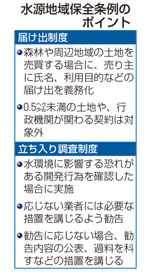 福島県は、本県の豊かな水資源を守るため制定した県水源地域保全条例の対象地域に、湯川村を除く58市町村の計2331区域を指定する方針を固めた。国有林以外の森林がある地域を大字単位で指定、県土の約7割が対象となる。条例は来年2月に施行される予定で、対象地域内の土地売買契約の事前届け出が義務化されるなど、乱開発から水資源を守る取り組みが加速する。 条例のポイントは【表】の通り。土地の売買契約を結ぶ...