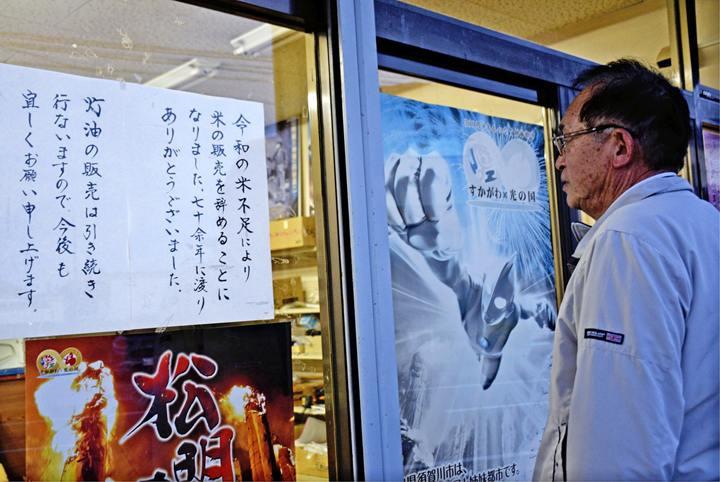 「令和の米不足により米の販売を辞めることになりました。七十余年に渡りありがとうございました」。須賀川市でコメを取り扱っていた商店の店先に、1枚の紙が張り出されている。「こんなことは今まで経験したことがなかった」。祖父から3代、75年近くコメ販売などを営み、今年に入ってコメの取り扱いをやめた男性店主(70)は話す。