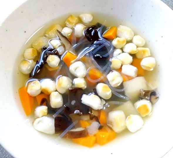 3人は「会津の郷土料理を広めたい」との思いから、「んめぇ!会津のこづゆ風スープ」を考案した。白だしをベースに、ニンジン、シイタケ、豆麩(まめふ)などこづゆの具材を使ったスープに仕上げた。フリーズドライに向かない糸こんにゃくを春雨で代用するなど工夫を凝らした。3人は「決勝に進めることがうれしい。スープを通してこづゆのおいしさを広めたい」と力を込めた。