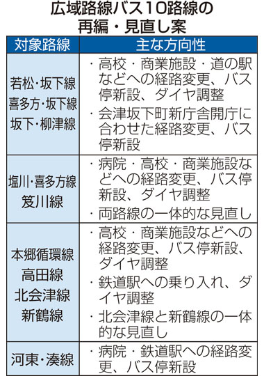 福島県は27日、会津若松、喜多方、会津坂下、湯川、柳津、会津美里の6市町村を対象とした広域路線バスの全10路線を再編、見直す案を示した。高校や病院など移動需要の高い施設を経由する路線への変更やダイヤを調整する。効率的な運行や一定の利用が見込めるように改善し、バスの持続性や生産性向上につなげる。
