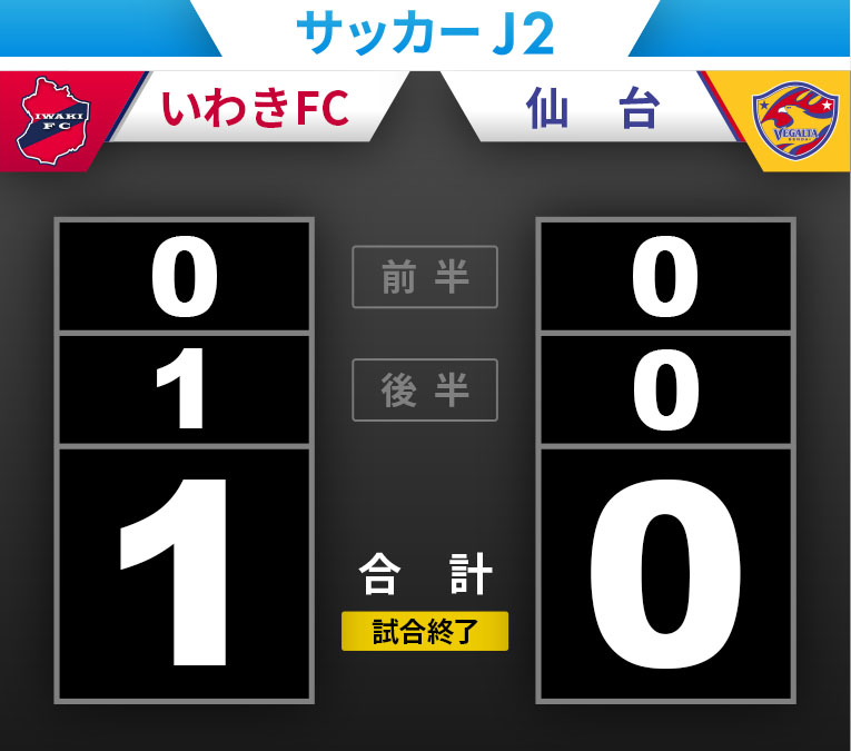 サッカーJ2のいわきFCは29日、アウェーのユアテックスタジアム仙台(仙台市)で仙台を1―0で下し、今季最終節を勝利で飾った。通算成績は15勝11分け12敗で、20チーム中9位で今季を終了した。 #いわきFC この記事をSNSで伝える: