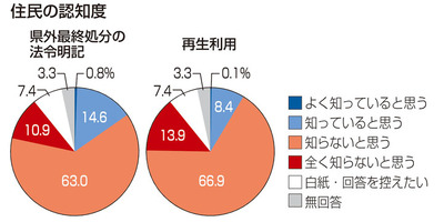 東京電力福島第1原発事故に伴う県内の除染で出た土壌などの県外最終処分を巡り、福島民友新聞社と東京大大学院の関谷直也教授が全国の自治体の首長を対象に実施した調査で、回答を得た902人のうち、42.7%に当たる385人が土壌の大半を公共工事で再生利用する方針について「知らなかった」と答えた。政府が目指す再生利用事業の全国展開に向け、受け入れの可否を判断する自治体トップに事業そのものの認知度が広がって...