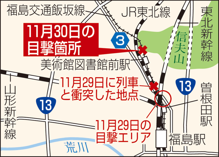 周辺では11月29日午前、同市森合のガード下周辺で目撃情報があったほか、同日夕にはクマと阿武隈急行線普通列車が衝突する事故もあった。同署はクマが同日に目撃された個体と同一かは不明としている。