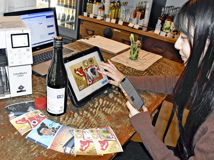 体験は店内でタブレット端末を操作し、事業に参画するエプソンの印刷機器でラベルを刷って瓶に貼る仕組み。赤べこや白虎隊、鶴ケ城がデザインされたテンプレートを選び、自身のスマートフォンから写真を組み合わせることができる。作業は5分以内で、手軽に体験できる。