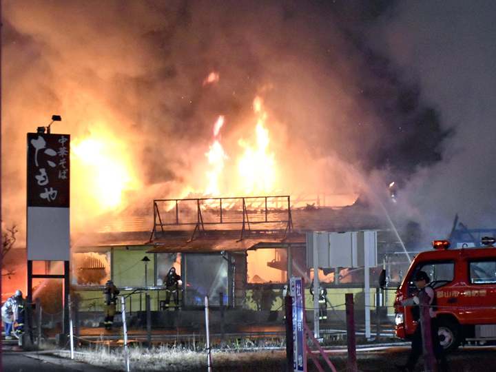 激しく炎を上げて燃える飲食店・住宅=7日午後7時ごろ、郡山市巳六段 7日午後6時25分ごろ、郡山市巳六段、飲食店経営の男性(31)方から出火、木造2階建て店舗・住宅約280平方メートルを全焼した。けが人はいなかった。 郡山署によると、出火当時、男性の家族4人が在宅していたが、逃げ出して無事だった。飲食店は営業していなかった。同署が原因を調べている。 #社会 この記事をSNSで伝える: