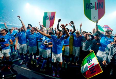 【ロンドン共同】サッカーのイタリア1部リーグ(セリエA)は23日、最終節の2試合が行われ、ナポリがホームでカリャリに2―0で快勝して24勝10分け4敗の勝ち点82とし、2季ぶり4度目の優勝を果たした。今季就任したコンテ監督はユベントス、インテル・ミラノに続き、リーグ史上初めて三つのクラブを優勝に導いた。