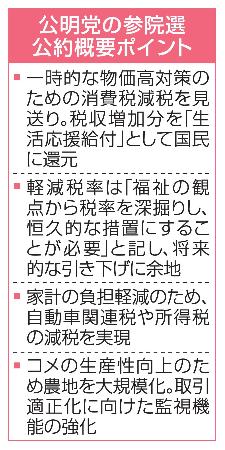 公明党の参院選公約第2弾の概要が判明した。当面の物価高対策として当初検討した、食料品などに適用される消費税の軽減税率引き下げは見送る一方、税収増加分を国民に還元する「生活応援給付」を盛り込む。関係者が5日明らかにした。連立を組む自民党が公約に消費税減税を入れない方針を固めたため、与党内の不一致を避ける必要があると判断したとみられる。斉藤鉄夫代表が6日の記者会見で発表する予定だ。