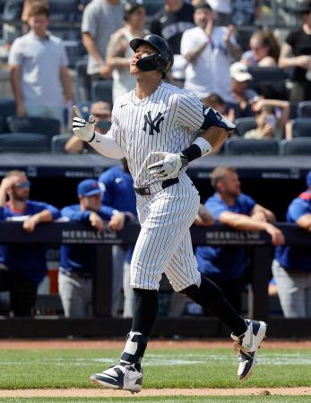 ヤンキースのジャッジが12日、大リーグ史上最速の出場1088試合目で通算350本塁打に到達した。カブス戦の九回1死二塁で、高めの直球を右中間席へ放り込む今季35号を放った。