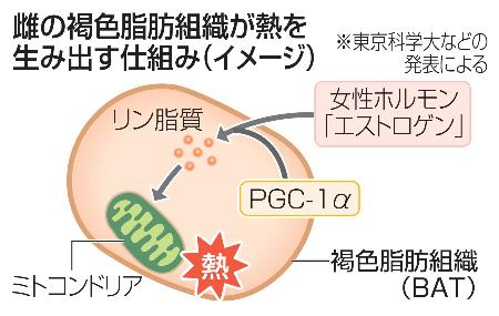 体内でカロリーを消費して熱を生み出す「褐色脂肪組織(BAT)」が、雄よりも雌で効率よく働く仕組みをマウスの実験で明らかにしたと、東京科学大などの研究チームが14日、英科学誌「ネイチャーコミュニケーションズ」に発表した。女性ホルモンと、性別によって働きに差があるタンパク質が関与していた。