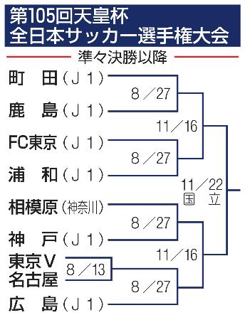 町田は鹿島、FC東京は浦和との対戦が決まり、4回戦の東京V―名古屋(13日)の勝者は広島と顔を合わせる。
