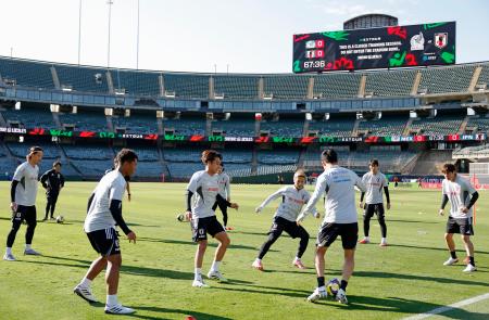 【オークランド(米カリフォルニア州)共同】サッカー日本代表は6日午後7時(日本時間7日午前11時)から米カリフォルニア州オークランドでメキシコ代表と対戦する。5日は試合会場で最終調整し、公開された冒頭では上田(フェイエノールト)堂安(アイントラハト・フランクフルト)らが球回しなどで体をほぐした。