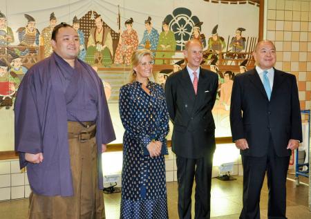 チャールズ英国王の弟エドワード王子と妻ソフィ妃が19日、大相撲秋場所6日目を観戦に東京・両国国技館を訪れ、日本相撲協会の八角理事長(元横綱北勝海)と元大関の十両朝乃山が出迎えた。
