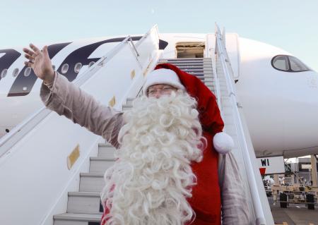 赤い帽子と服に白ひげをたくわえたサンタは、飛行機から手を振りながらタラップで降りてくると、通訳を介して「メリークリスマス。日本の人と触れ合えるのを楽しみにしている」とあいさつ。子どもたちに向けて「クリスマスはもうすぐ。楽しく日々を過ごしてほしい」と話した。