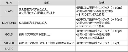ランクは毎月更新され、S.RIDEプレミアム加入や前月の利用回数などに応じて決定されます。上位ランクほど、より多くの特典を受けられます。